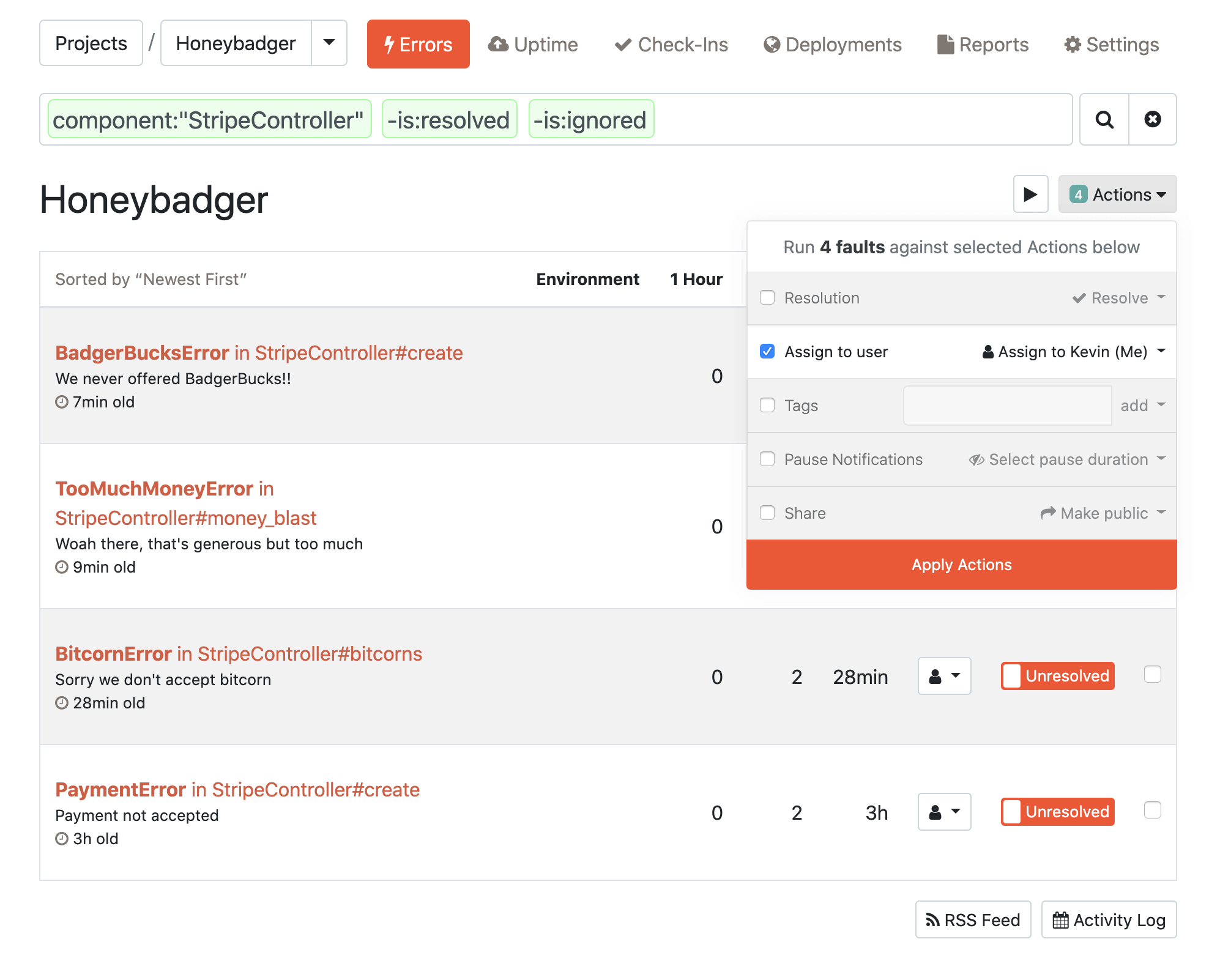 Batch Actions are similar to Project Actions, except they can be applied ad-hoc to any set of errors. We've added a new Actions dropdown to the fault search page. You can apply actions to all returned faults, or you can select specific faults by selecting checkboxes next to each fault.