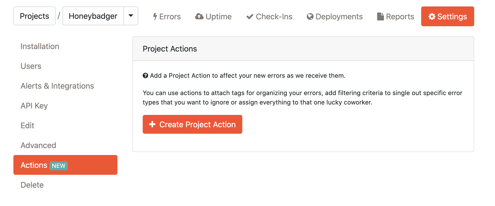 Let's create a Project Action and use filtering to apply an action only when an error comes from a Stripe callback controller: