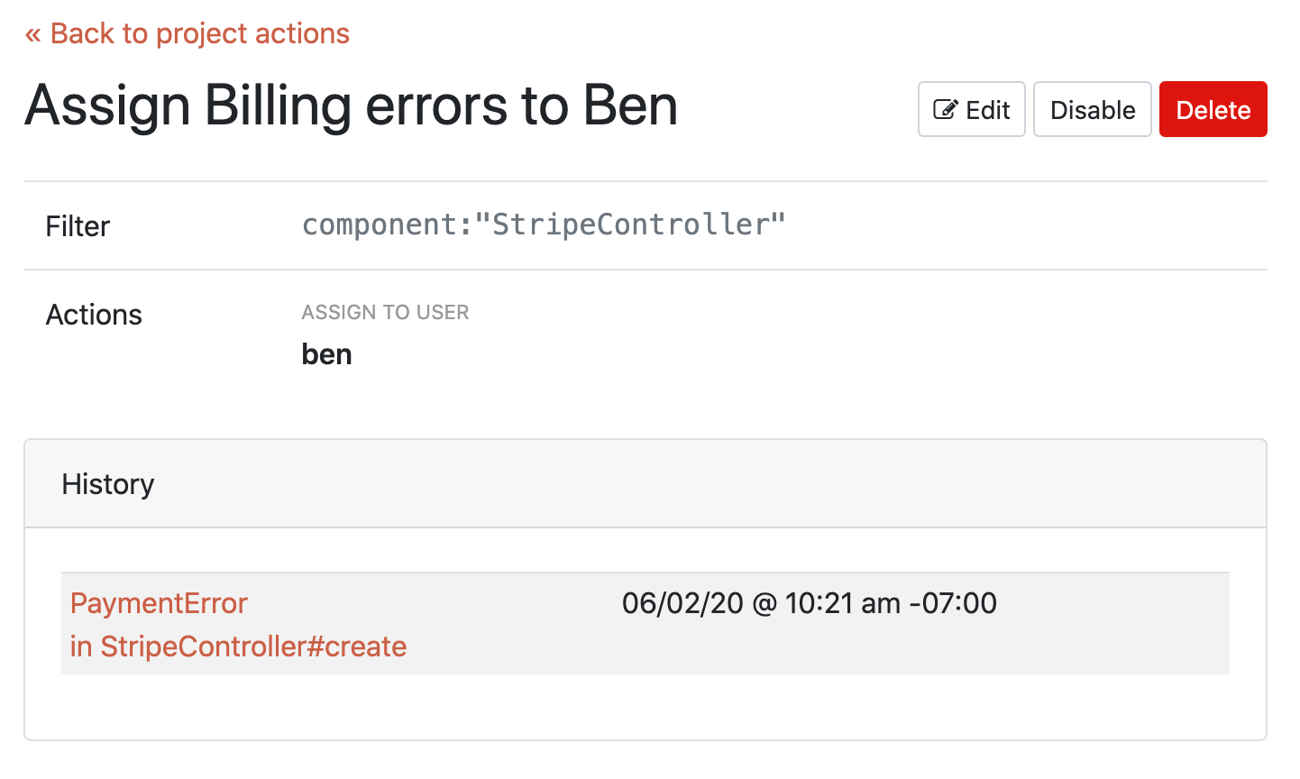 Now when an error is thrown from a Stripe controller, it will automatically be assigned to Ben. Yay! Look, you can see in the history that we already had a new error assigned: