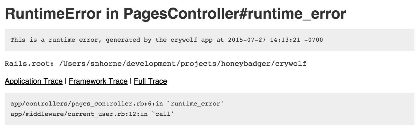 One of the nice things about working with rails is that when something goes wrong in development, you get a really nice error detail page. You get a nice backtrace, with the parts relevant to your app highlighted. You can see the params that got posted, as well as inspect environment and session variables.