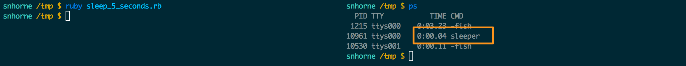 But the default process names are less helpful when you have a Ruby script that you're running from the command line. In the example below, I'm running a ruby script that sleeps for five seconds. If I simultaneously run "ps" in another terminal window, I see that the process name for my sleeper is "ruby sleep_5_seconds.rb". If I were to add command line arguments, those would show up in the process name as well. This would make it difficult to refer to the process by name.