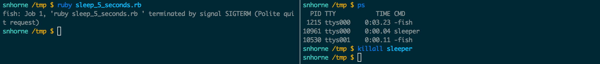But even better, we can now easily refer to the process by name. Suppose I get tired of waiting for my sleeper to sleep. I can kill it using the command killall sleeper .