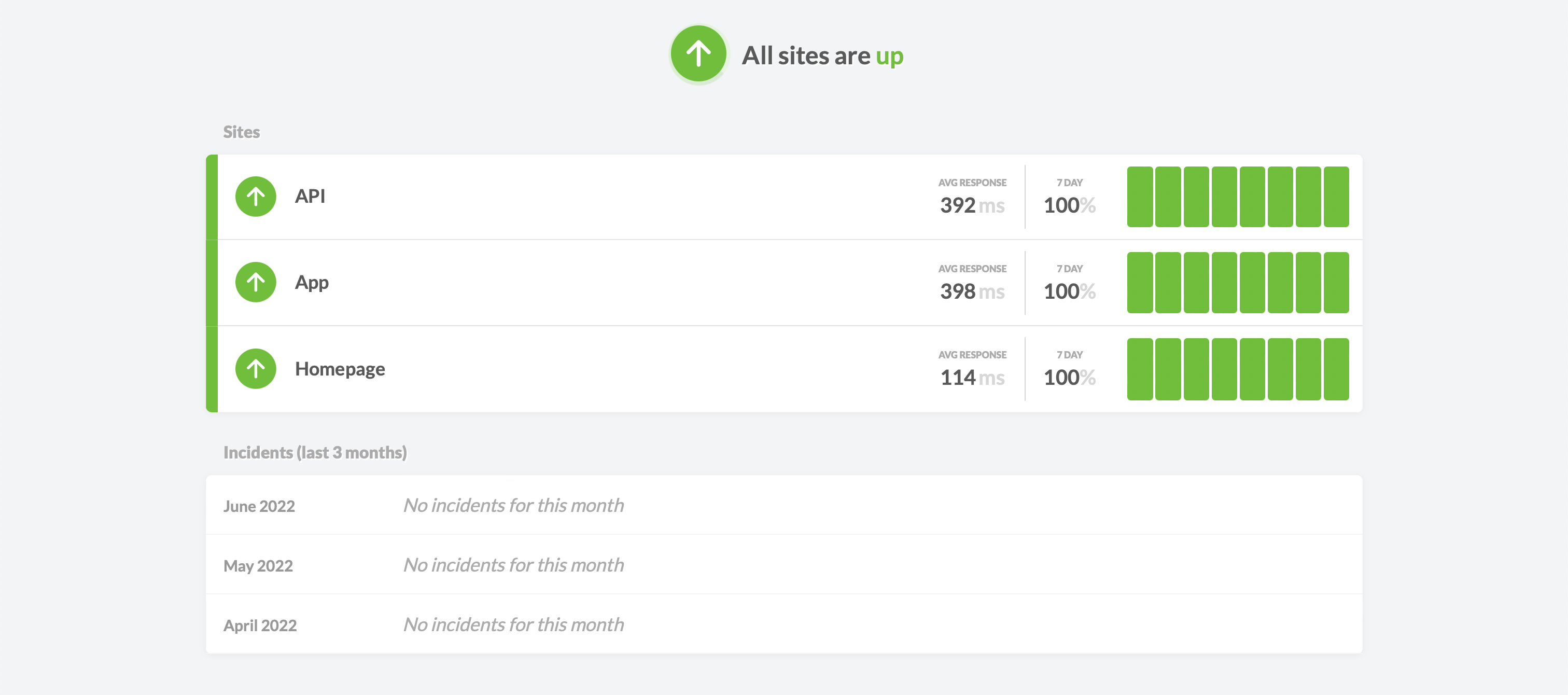 Incident management lets you report an incident in real time, schedule an alert for upcoming maintenance, or retroactively insert an update for a past incident. Each report includes the status of the incident, the severity, as well as a description field to tell your users exactly what to expect.