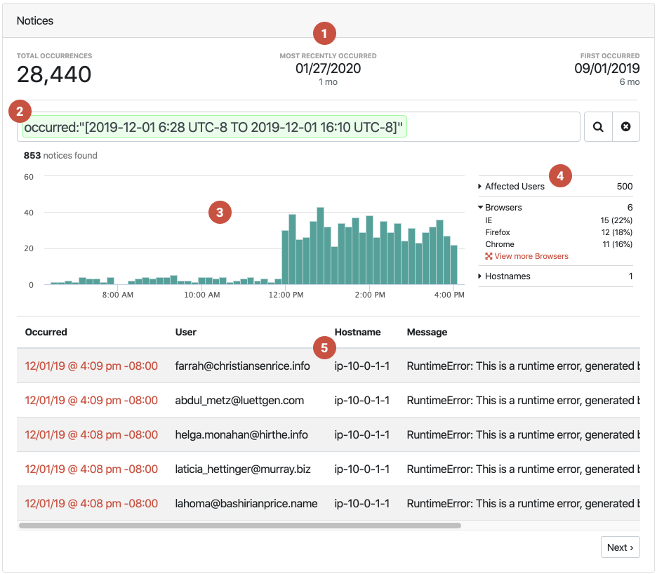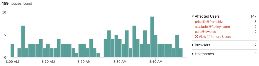 The search functionality should feel familiar, as it works exactly like our Project search only constrained to data found within your Notices. For the launch of the new search we are aggregating some common data points for you: Affected Users, Browsers, and Hostnames.