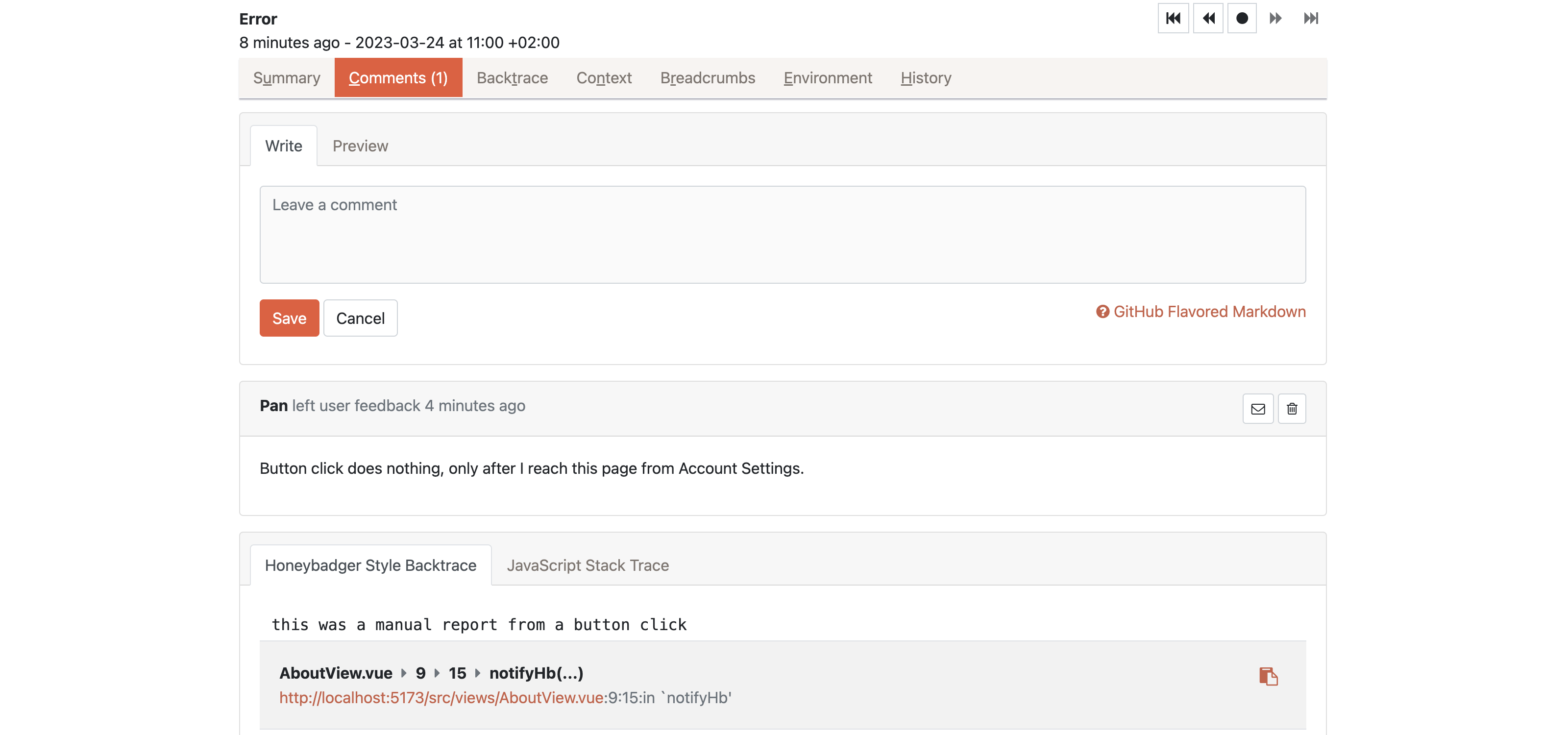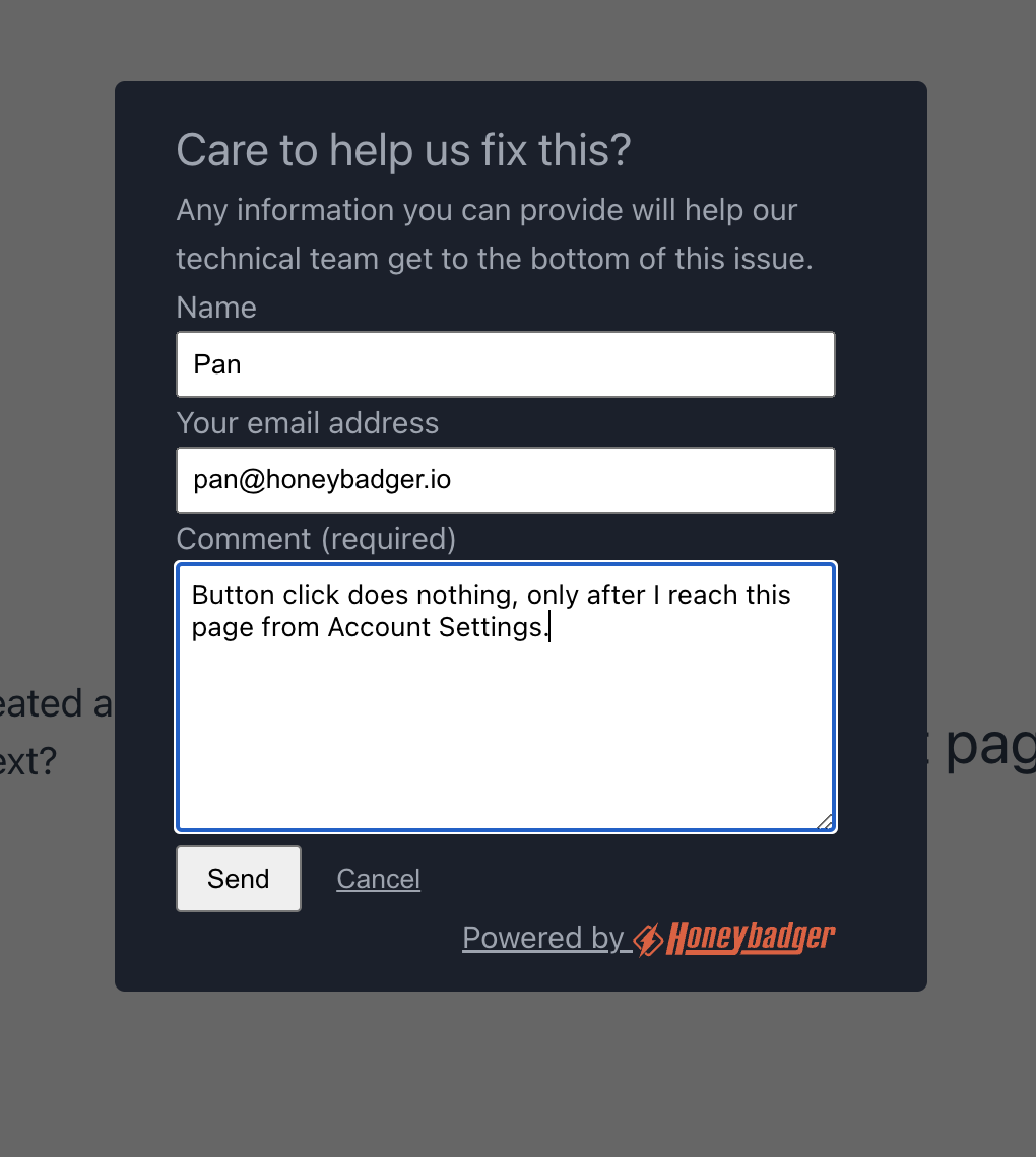 When an error occurs, the form will be displayed—notifying the user of the issue and allowing them to add their account of what happened. After they submit the form, their comment is added to the error in Honeybadger: