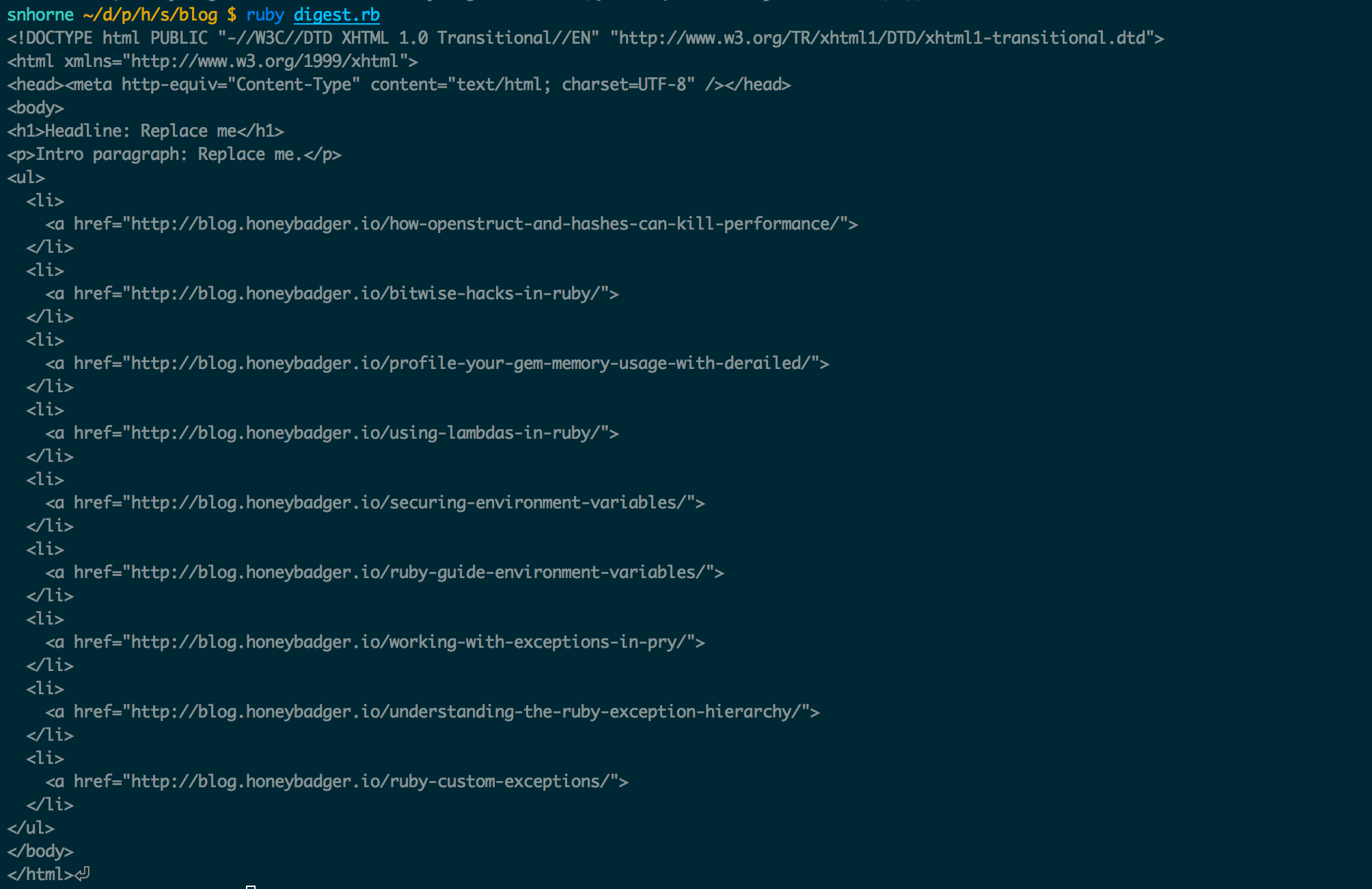 Putting these digests together manually takes too much time. But going full-auto is too impersonal. So what I want is a semi-automated process. I need a script that will fetch our most recent blog posts and output an HTML email that I can personalize.