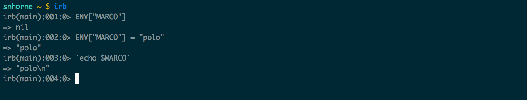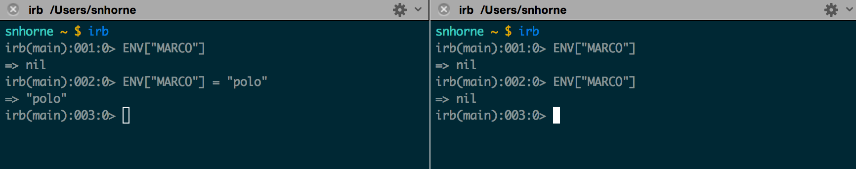 Since IRB is the parent process of the shell I just created, it gets a copy of the $MARCO environment variable.