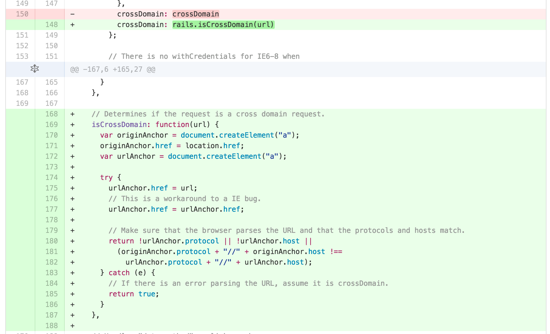 The vulnerability existed because jquery-ujs didn't check for cross-domain requests