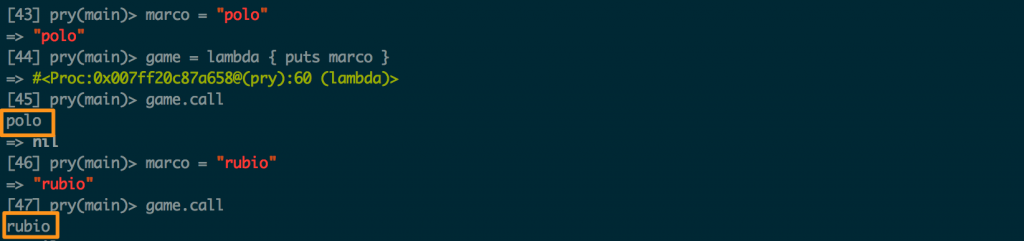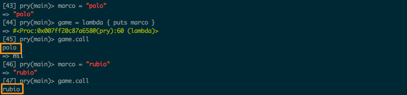 What does it mean to be able to access other variables local to the scope the lambda was created in? Let's take a look. In the example below I've created a local variable named marco. I can use that variable inside of my lambda. And if I change the value in that variable, the lambda sees the new value.