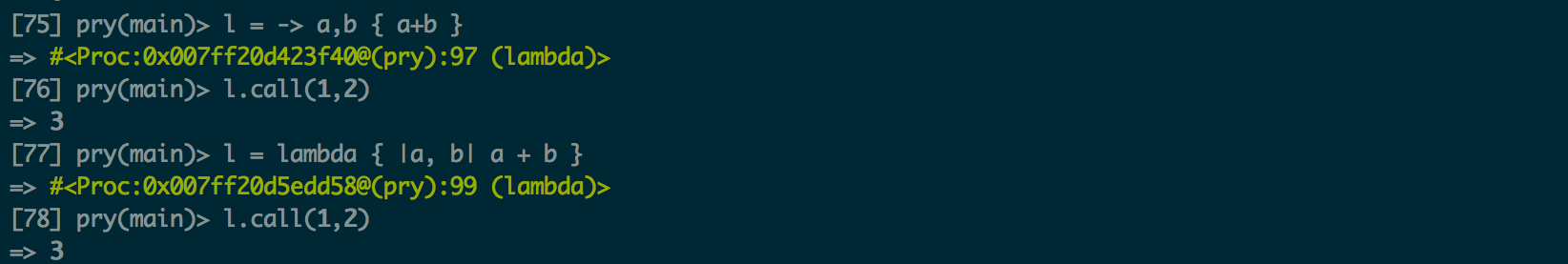 In this article I've used the lambda keyword for clarity. But there's a more concise syntax for defining lambdas introduced in Ruby 1.9 and known as the "stabby lambda." Here's how it works: