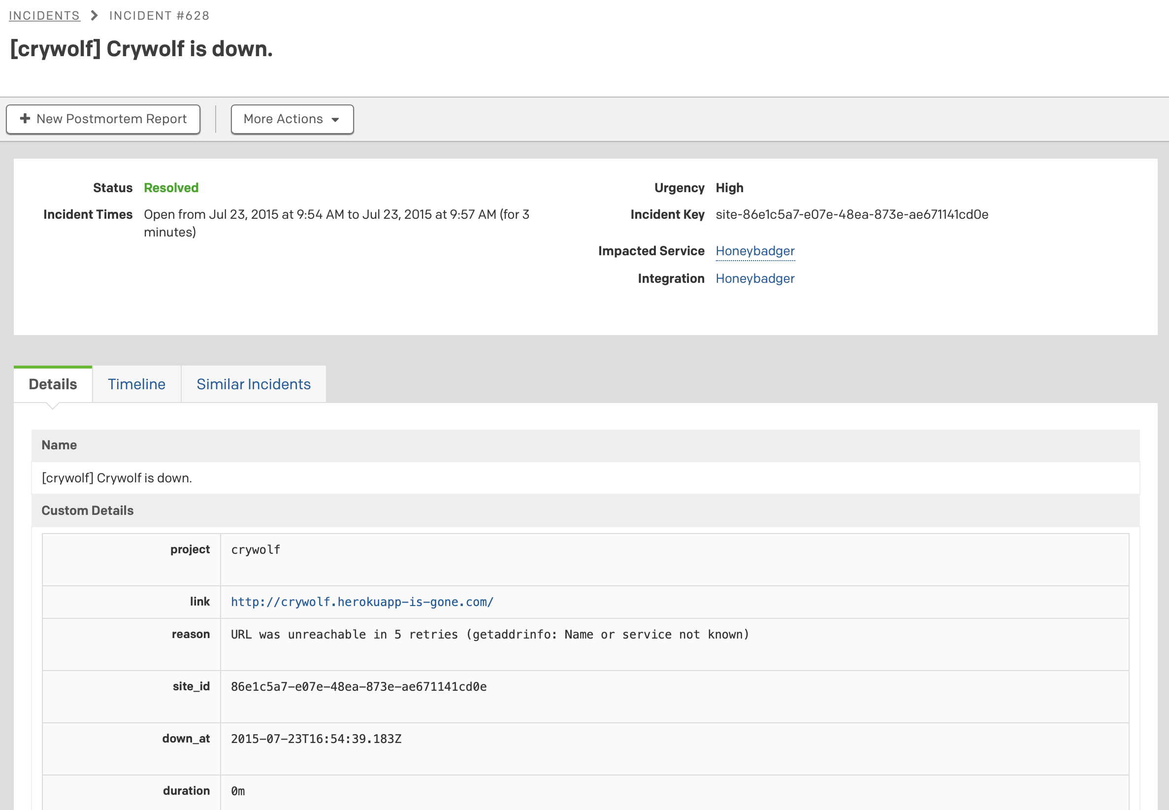 Honeybadger sends critical info about what triggered the Incident to PagerDuty, so you don't have to go on a scavenger hunt at 4am.