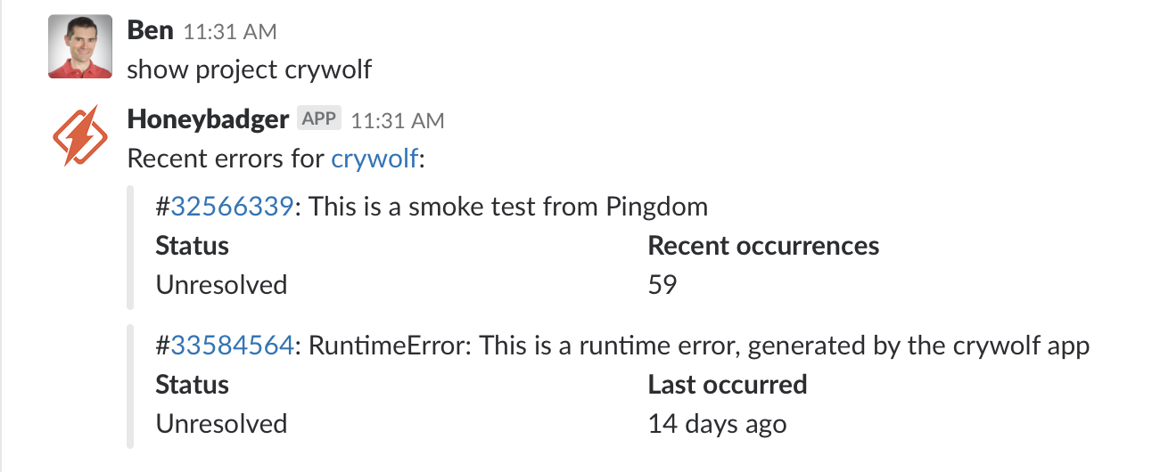 With our helpful bot, you can get the low-down on your app's health from the comfort of your Slack channel. Find out what errors have happened lately on one of your projects, mark an error as fixed, and more, without leaving the keyboard.