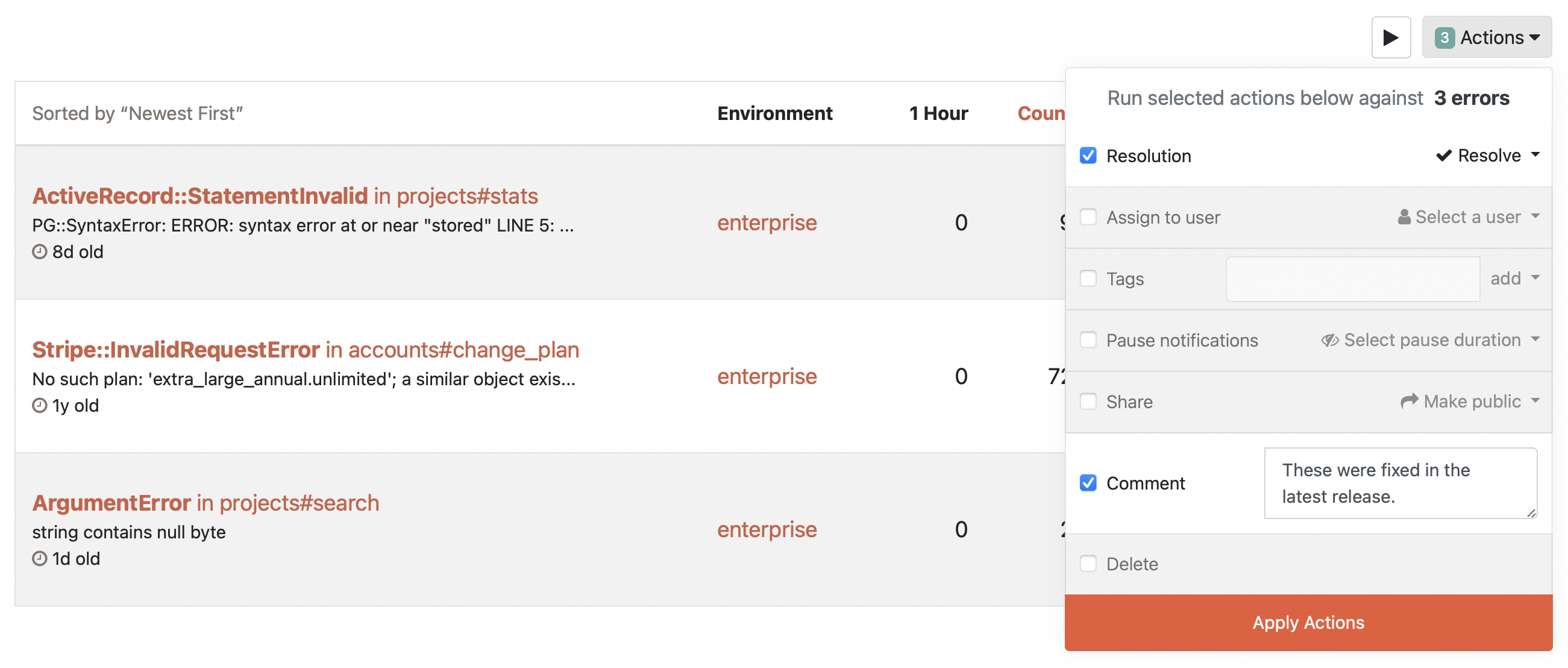 Apply common actions to a set of search results immediately, or create an automated search to update new errors as they occur. Learn more