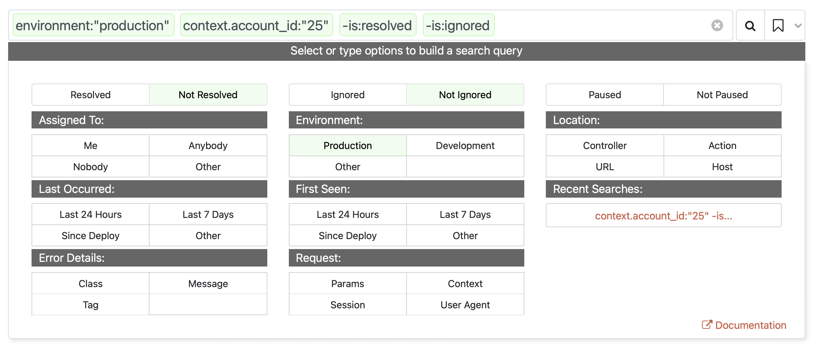 Drill down into your data to find specific errors with Honeybadger's powerful search query builder. You'll especially love our intelligent autocomplete and cross-project search. Learn more